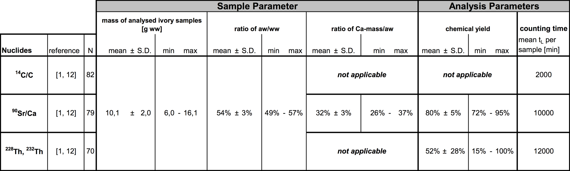 The analytical procedures described here aim to determine the post mortal interval (PMI) of elephants for the purpose of the protection of elephant species. Its development and validation has been described in the final report to the Federal Agency for Nature Conservation (SCHUPFNER 2012). The analytical procedures applied are validated to age representative elephant ivory samples of masses ranging from about 7 g to about 12 g. For this purpose, the values of the specific activity of 14C/C and 90Sr/Ca and 228Th/232Th are determined and compared to calibration curves of the values of PMI as a function of the analyses results.