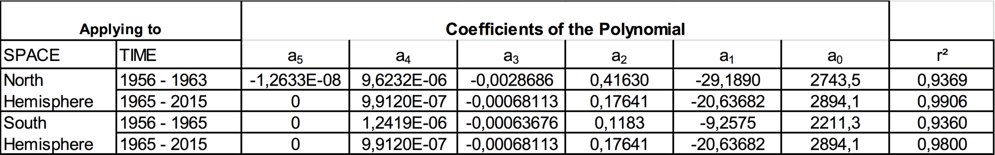 Table 2: Coefficients of the polynomial functions a0 to a5 determining TD (14C/C) within an interval of TD ranging from about 1954 to 2015.