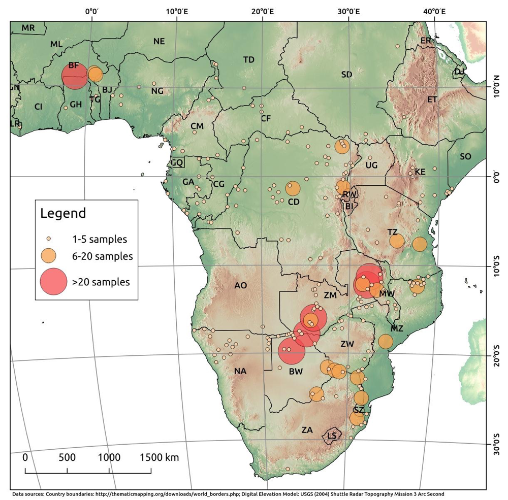 The reference data set consist of more than 700 ivory samples that were collected between 2009 and 2014 from 30 African and six Asian elephant range states from European museums and collections, trophy hunters and via protected areas and CITES management authorities in African elephant range states (Ziegler et al. 2016). The exact provenance of sampled material was not always known, but geographic locations, such as proximity to a village or a river or coordinates were curated for most of the collected tusks from more than 380 reference sites in Africa with 1-28 samples (see figure below). It needs to be stated that limited sampling size bears the risk of cutting natural variation in the respective reference sites, so that samples may be traced to a completely different area.
