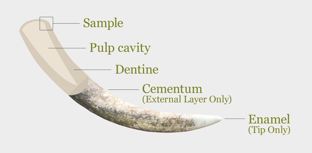 In most cases, ivory fragments of at least 30 mg and less than 2 mm thickness were taken from the most proximal end of the tusk by using a small handsaw or a pincer (see figure below). This section is largely composed of cementum, it is less than six months old and thus minimizes within-individual variation. As this is the most recently-formed and youngest part of the tusk, the isotopic signal reflects the most recent living environment. Thus, attempts to assign an individual elephant to the environment where it died should restrict sampling to the most recently-formed part of the tusks.
